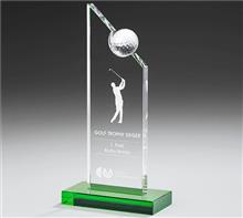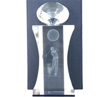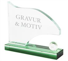 Glastrophäe mit mattiertem, plastischem Golfball zur direkten Gravur. Glasstärke: 16mm