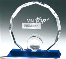 Kristallglas in 18mm Stärke mit Facettenschliff, Ø40mm Golfball auf tiefblauem Kristallglassockel.