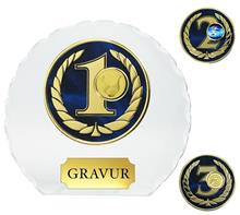 Glastrophäe mit "Muschelbruchrand" inkl. blau-marmorierter Metall Zierplatte mit goldenem Lorbeer und Ziffern "1-2-3" und Motiv Ø25mm Ihrer Wahl.