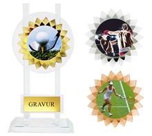 Glastrophäe mit Streifendesign inkl. Motiv Ø50mm "Sportmotiv Folie Färbig" oder  "Metall-Motiv Gold"