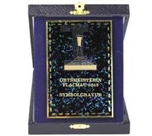 Blaue Kassette inklusive blau marmorierter Messingplatte mit Goldzierrand.