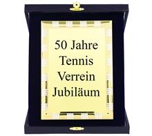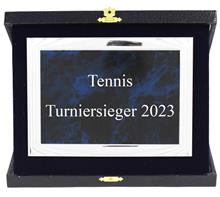 Blaue Samtkassette 19x23cm inkl. Zierplatte in Gold mit weißen Streifen und Motivhalterung mit Motiv Ø50mm  "Sportmotiv Folie Färbig" oder  "Metall-Motiv Gold"