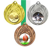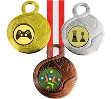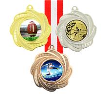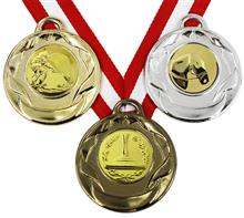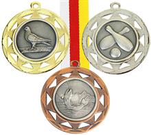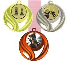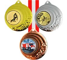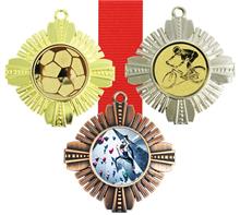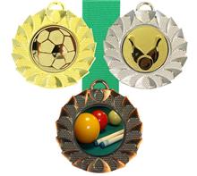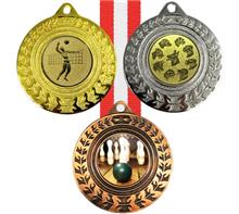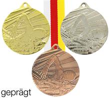 MEDAILLEN wahlweise KOMPLETT MONTIERT oder LOSE zur SELBSTMONTAGE mit geprägten STANDARDMOTIVEN, 2,2cm STOFFBÄNDERN u. eventuell FOLIENSCHILD mit Metallic-Effekt.