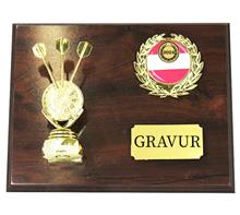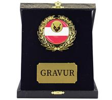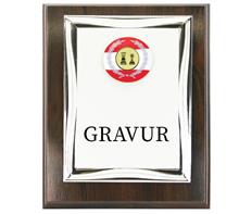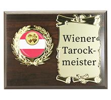 Braunes Holzschild 20x15cm zum Hängen oder Stellenmit Urkundenplatte 8,5x13cm inkl. Motivhalterung mit färbigem Motiv "Rot-Weiss-Rot" und Motiv Ø25mm Ihrer Wahl.