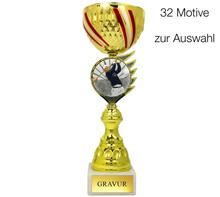 Exklusiver Pokal in kompletter METALLAUSFÜHRUNG mit Motivhalterung inkl. färbigem Österreich Hintergrund und Motiv Ø25mm "Sportmotiv Folie Färbig" oder  "Metall-Motiv Gold"