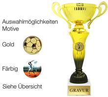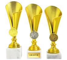 Moderne, goldener Pokal inkl. Motiv Ø25mm "Sportmotiv Folie Färbig" oder  "Metall-Motiv Gold"