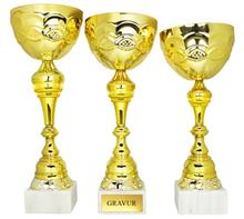 Kleiner Henkel-PVC-Pokal in Gold, Silber und Bronze Ausführung mit schwarzem Marmorsockel.