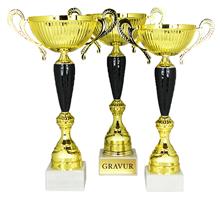 PVC-Henkelpokal in GOLD-SILBER-BRONZE auf schwarzem Marmorsockel.