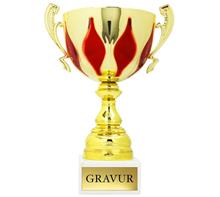 Pokal in Rot-Gold-Kombination auf schwarzen Marmorsockel.
