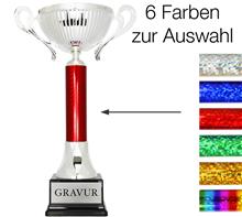 Effektvoller Henkelpokal in Silber-Rot-Kombination.