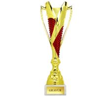 Attraktiver Henkelpokal in Rot-Gold-Kombination.
