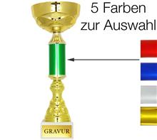Pokal in Gold mit Rohr in 5 Farben zur Auswahl inkl. Motiv Ø25mm "Sportmotiv Folie Färbig" oder  "Metall-Motiv Gold"