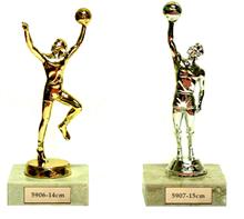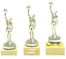Trophäe bestehend aus silbernem Rohr gehalten von zwei schwarzen Marmorsockeln inkl. färbiger Figur Multisport "BASKETBALL".