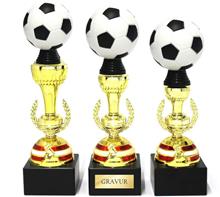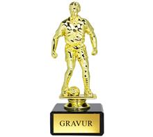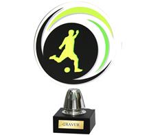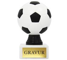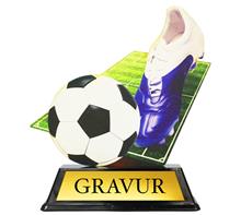 Färbige Acryltrophäe Motiv "Fussball" auf schwarzem Marmorsockel.