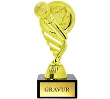 Goldene, plastische Figur "Mikrofon mit Noten"" auf schwarzem Marmorsockel.