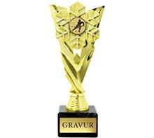 Goldene Trophäe "Schneeflocke" inkl. Motiv Ø25mm "Eisschnelllauf" auf schwarzem Marmorsockel.