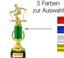 Kleine Trophäe "KÖSSEN" mit Skimotiv auf schwarzem Marmorsockel.